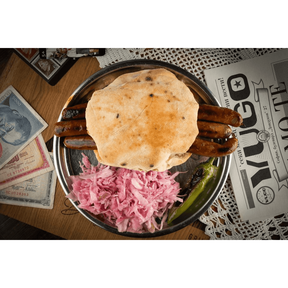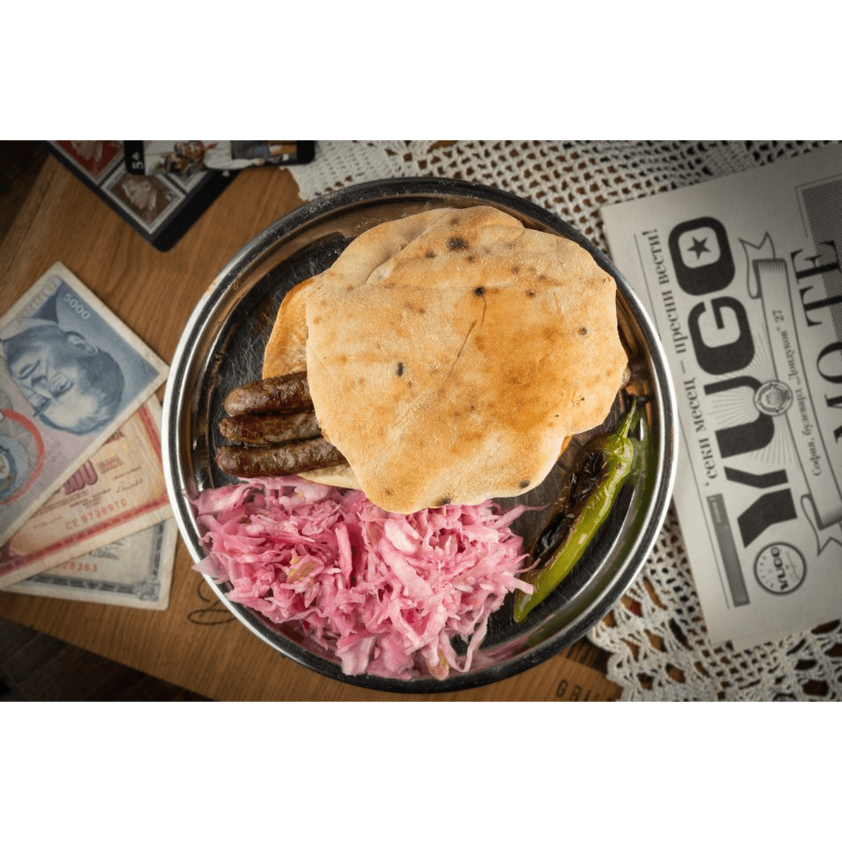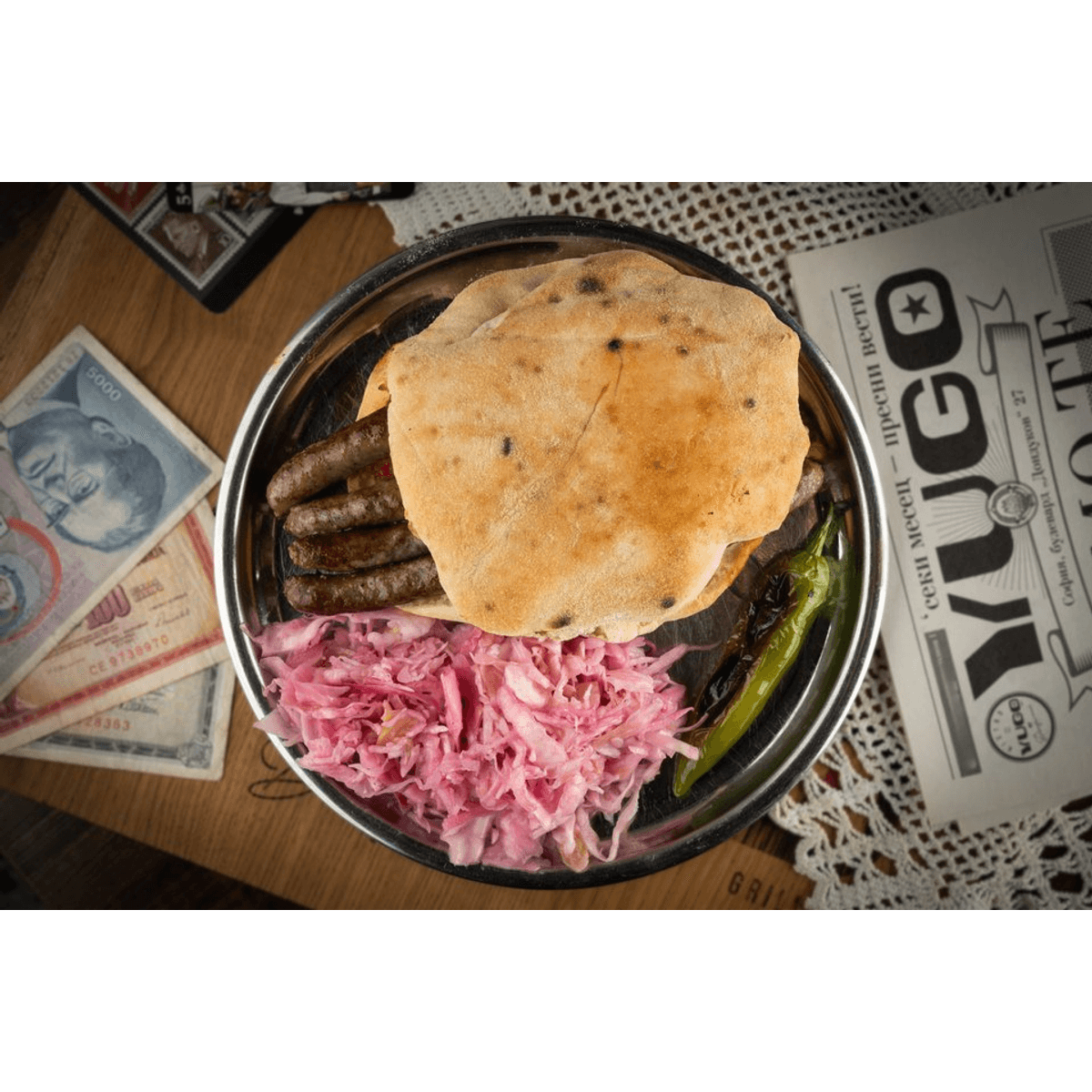 В половин лепиня (босненска питка), удобно са се разположили само две плочки от по четири босненски чевапчета.