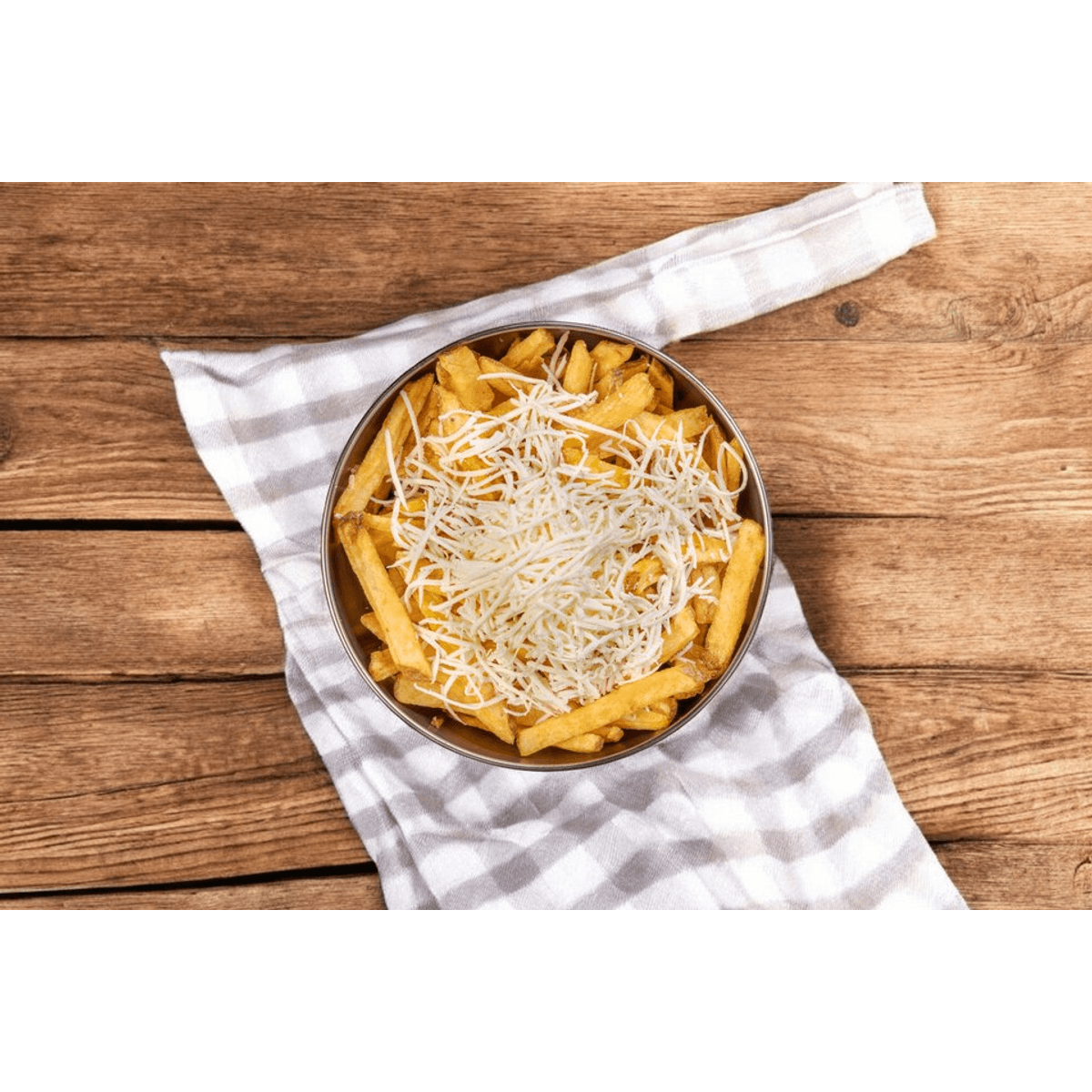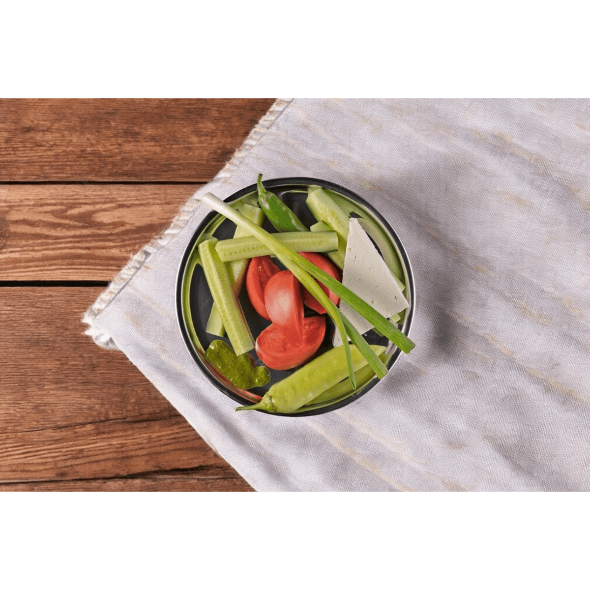 Едри парчета пресен лук, домат, плочка бяло саламурено сирене, свежа краставица, чушки и дресинг.