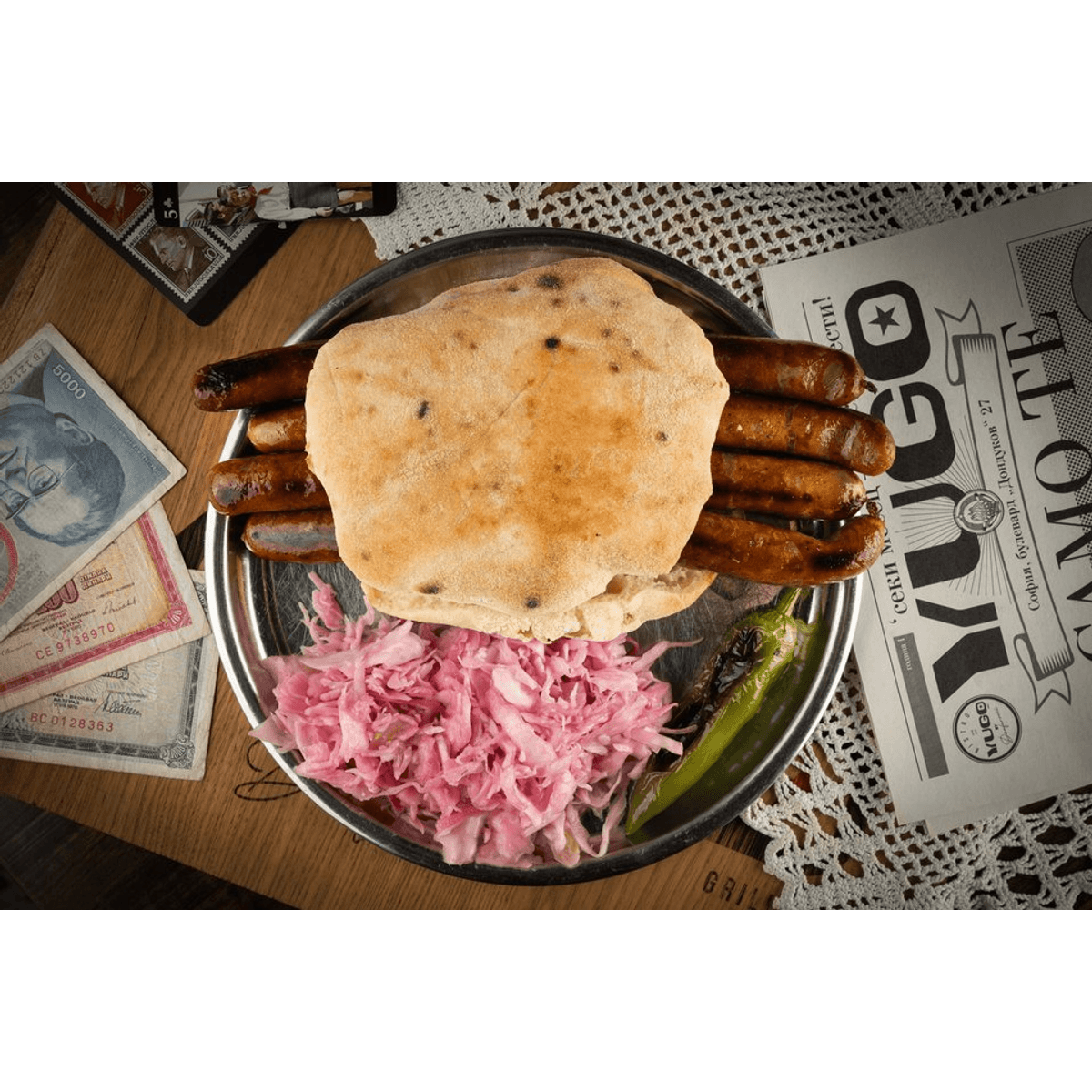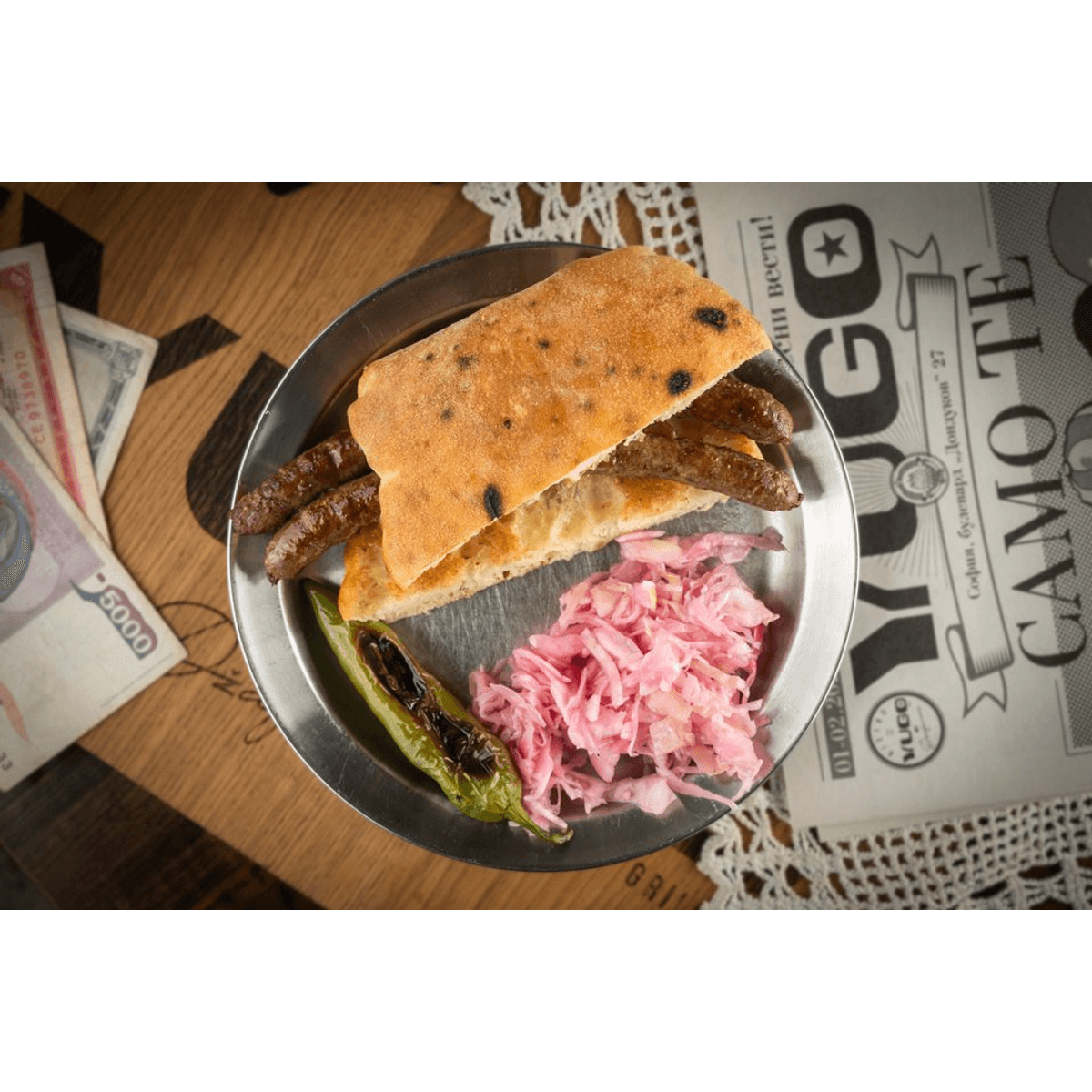 В босненската лепиня ще откриете два пикантни шиш чевапа и две плочки от по четири малки босненски чевапи с домат, лук и люта чушка.