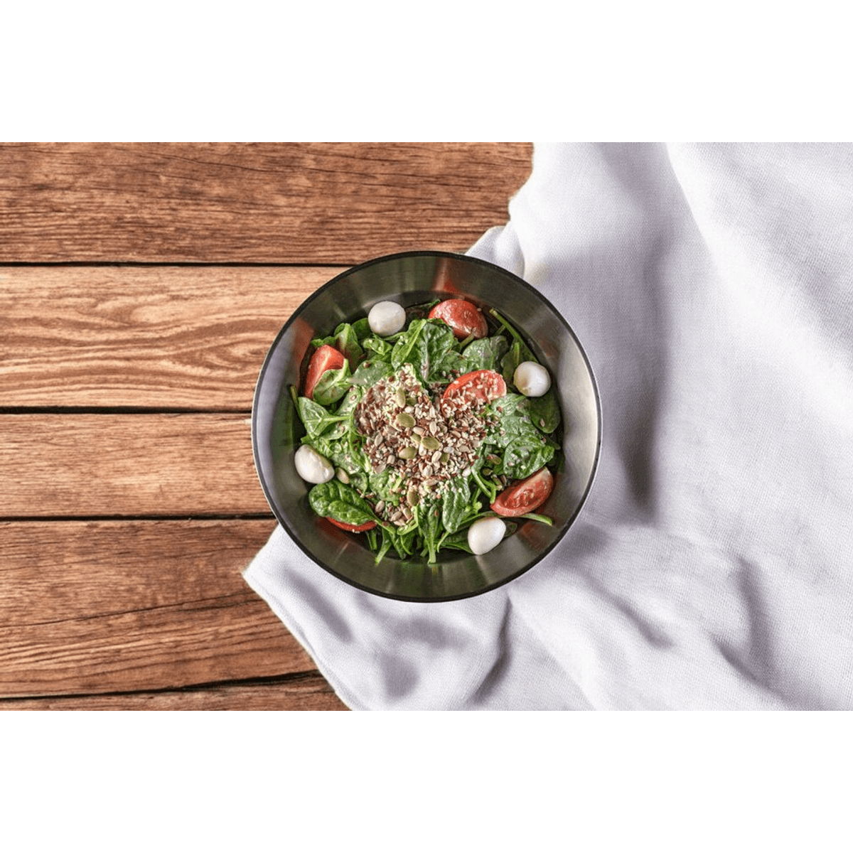 Бейби спанак, чери домати, моцарела, сос от горчица, зехтин и лимон.