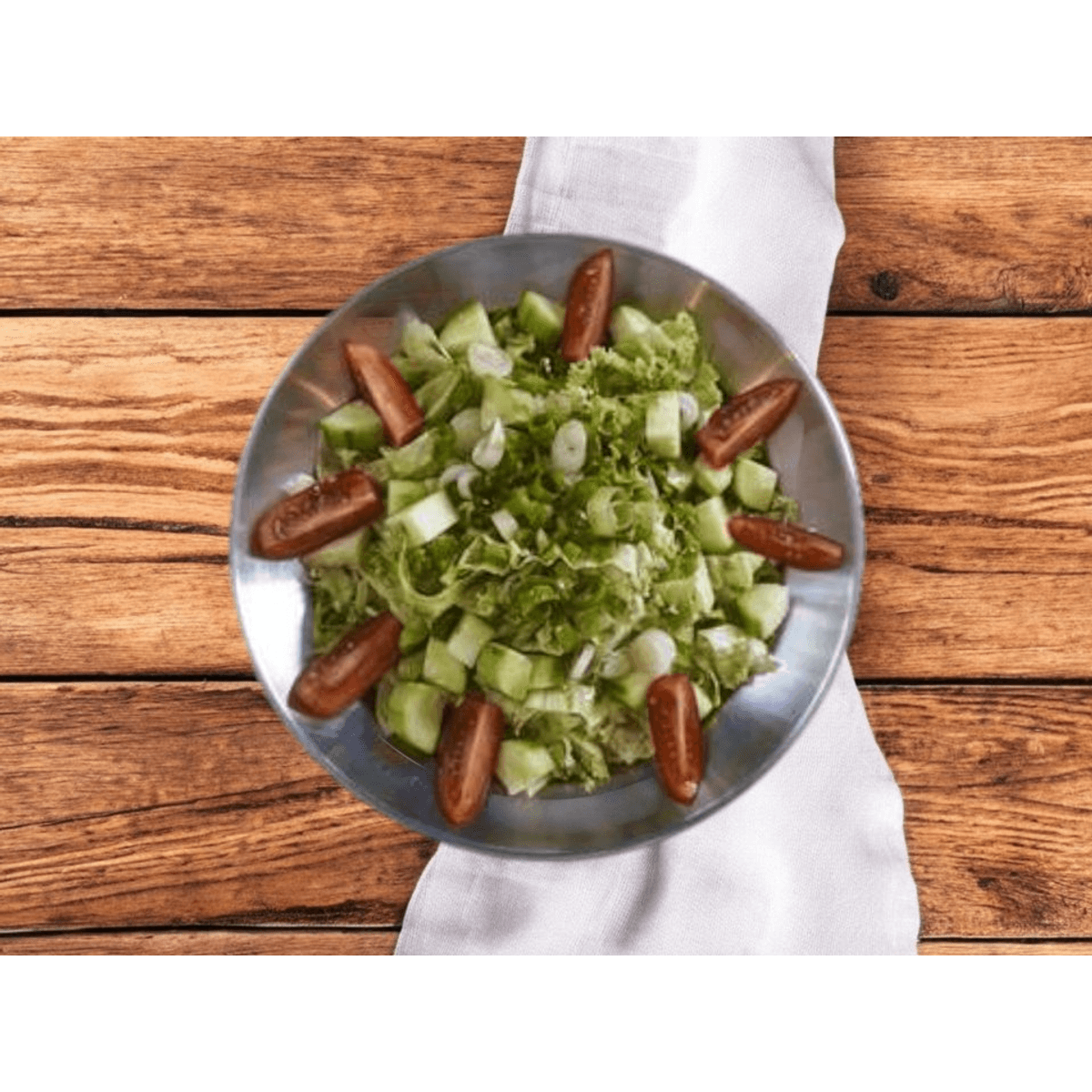 Ситно нарязана зелена салата с дребни колелца свежа краставица и разполовени чери домати.