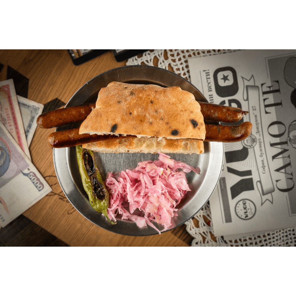 Сръбски опушени, леко пикантни наденици от свинско месо. Малка порция: две кобасици с половин лепиня.
